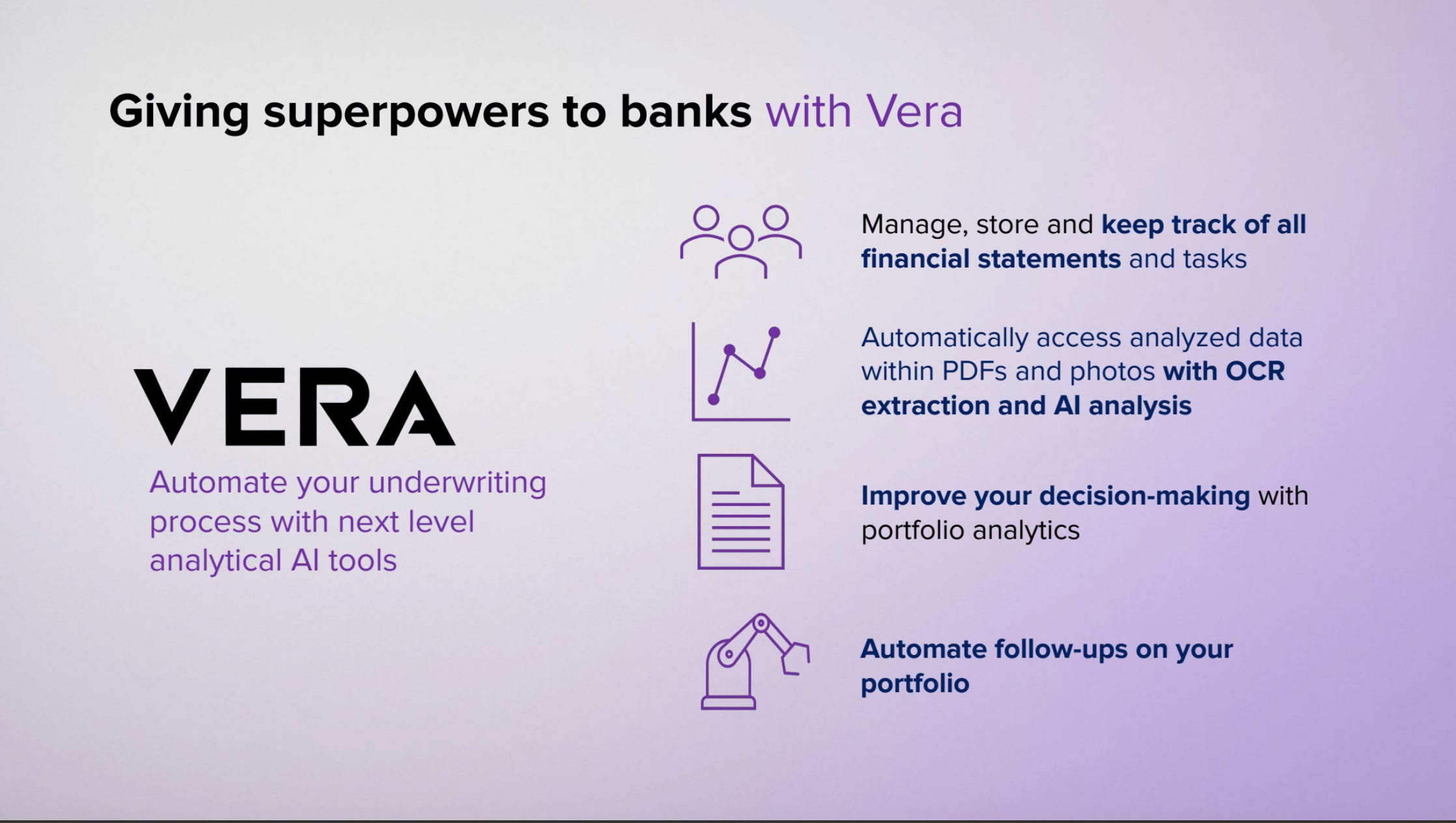 Vera es una plataforma B2B que automatiza la extracción y análisis de estados financieros para créditos empresariales en bancos de Latinoamérica. A través de OCR y modelos de inteligencia artificial, Vera transforma documentos financieros no estructurados en información estandarizada y accionable, permitiendo a los equipos de riesgo y crédito agilizar la evaluación, originación y seguimiento de préstamos.