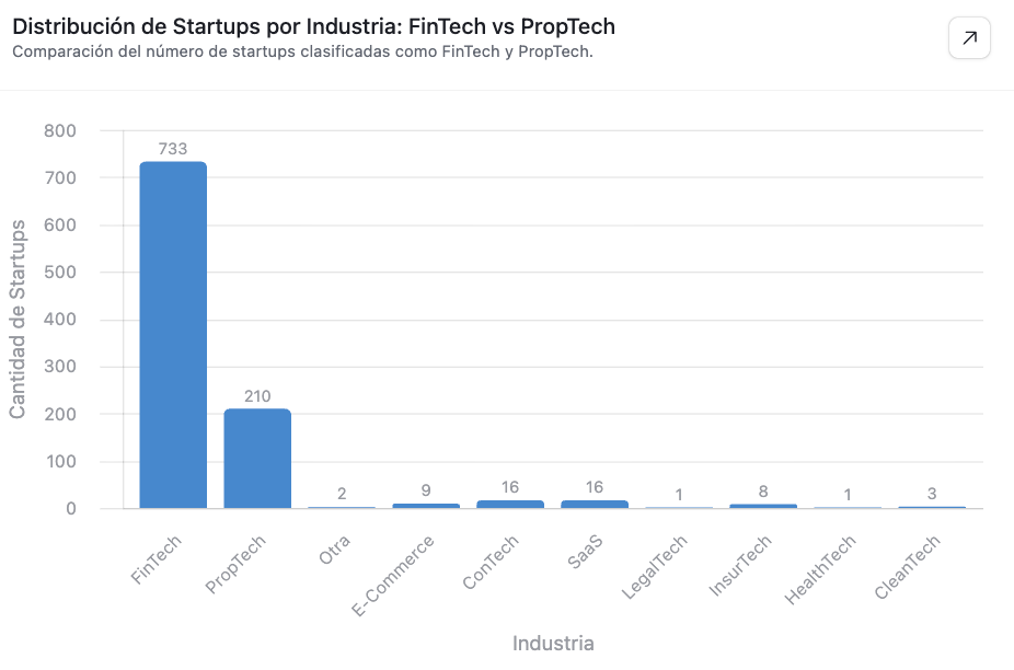 El dealflow está claramente concentrado en Fintech, que representa 73.4% (733 startups) del total, seguido por Proptech con 21% (210 startups).